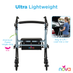Experience freedom and style with the NOVA "The Buzz" Lightweight Rollator, designed for those who value mobility and elegance. Weighing just 14 lbs, this sleek black rollator is effortlessly portable, making it ideal for active individuals on the go. Its adjustable frame accommodates users from 4'9" to 6'0", ensuring a perfect fit for everyone. The sturdy aluminum construction supports up to 275 lbs, providing reliable stability. With its easy-to-lift design, loading "The Buzz" into your car is a breeze. Available in four vibrant colors, this rollator not only meets your mobility needs but also makes a chic style statement. Embrace independence and confidence with every step.